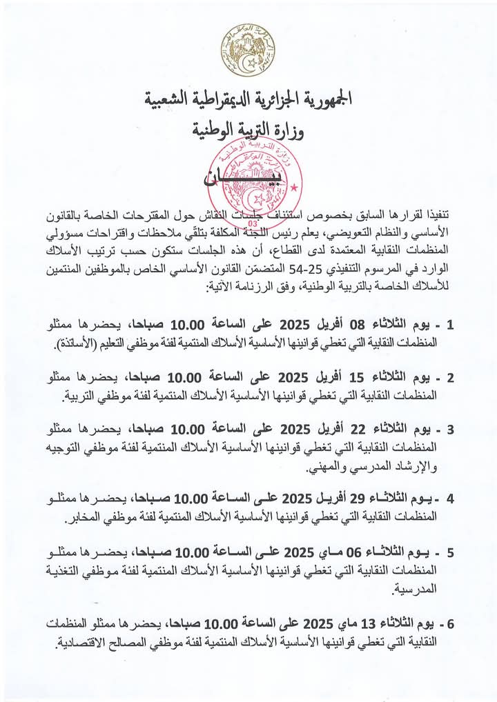 قررت وزارة التربية، تنظيم اجتماعين لدراسة الاقتراحات و الملاحظات، المقدمة بخصوص تعديل القانون الأساسي الخاص بالموظفين المنتمين لاسلاك القطاع، والنظام التعويضي.