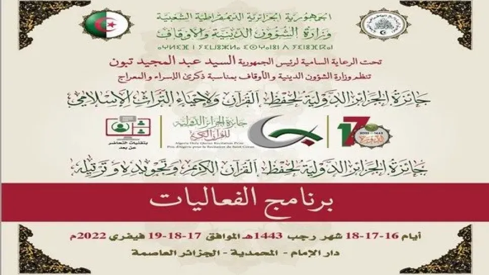 انطلقت اليوم الخميس بدار الإمام بالمحمدية (الجزائر العاصمة) فعاليات الطبعة الـ 17 لجائزة الجزائر الدولية لحفظ القرآن الكريم بمشاركة 46 دولة ممثلة للعالم العربي والإسلامي. وجاءت طبعة هذه السنة تحت شعار "ورتل القرآن ترتيلا". وكان من المفترض أن تكون هذه الجائزة قد بلغت هذه السنة طبعتها الـ 19، إلا أن تعليقها خلال سنتي 2019 و2020 بسبب الظروف الصحية التي فرضتها تداعيات انتشار جائحة كورونا، حال دون ذلك. وتنظم هذه الفعالية التنافسية الروحانية في طبعتها الحالية تزامنا وإحياء ذكرى الإسراء والمعراج (شهر رجب)، فيما كانت تنظم سابقا خلال شهر رمضان الكريم. ويرجع سبب تغيير موعد تنظيمها إلى الاستجابة لمجلس...