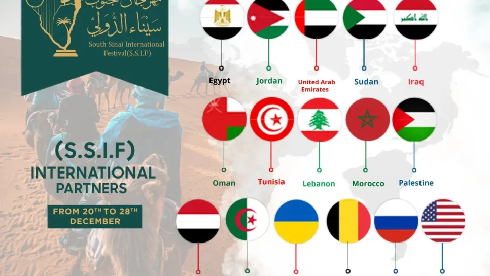 تشارك 15 دولة عربية في النسخة الأولى من مهرجان جنوب سيناء الدولي باستضافة عروض فنية ومسرحية وتراثية من الجزائر، الأردن، الإمارات، السودان، العراق، لبنان، المغرب، عمان، فلسطين، تونس، اليمن، أمريكا، بلجيكا، روسيا، وأوكرانيا. وينطلق مهرجان جنوب سيناء الدولي في نسخته الأولى من يوم 20 إلى يوم 28 من شهر ديسمبر المقبل بين مدينتي شرم الشيخ، ودهب، بتنظيم مؤسسة شريان النيل للتنمية، وتحت رعاية وزارة الشباب المصرية.