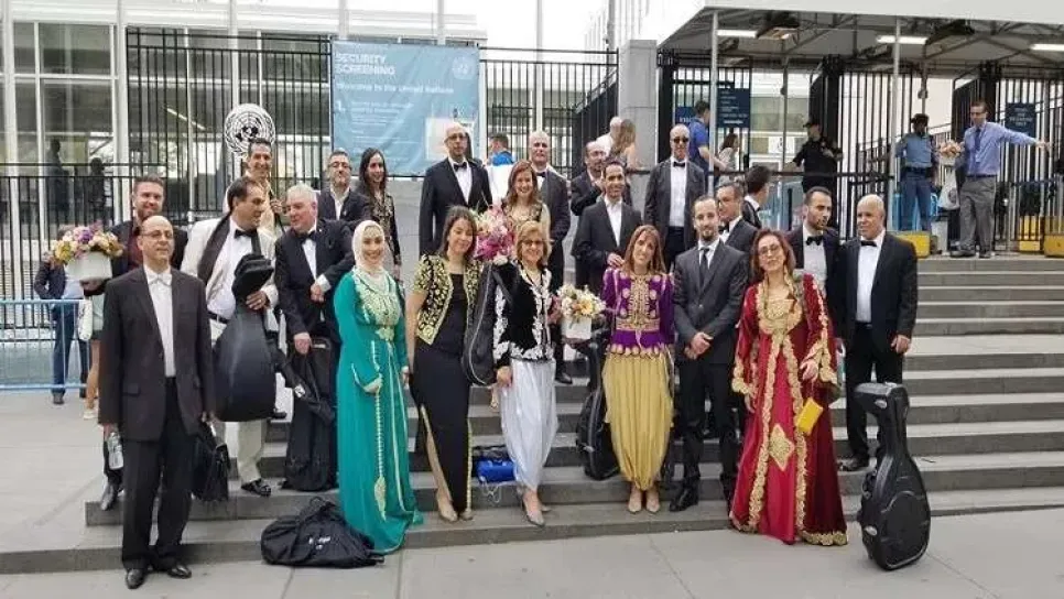 صدحت القاعة الرسمية لمبنى الأمم المتحدة في مدينة نيويورك الأمريكية، أمس السبت، بالألحان والأغاني الجزائرية. وأقامت جمعية "مزغنة" بموريال الحفل الذي حضره ممثلو الدول في الهيئة الأممية. وأطرب الفنان سليم فرقاني وفرقة مزغنة موريال الحضور بنغمات أصيلة لموسيقى المالوف والموسيقى الأندلسية الجزائرية، حيث رقص الحاضرون على أنغام المالوف والأندلسي والأغاني التراثية الجزائرية.