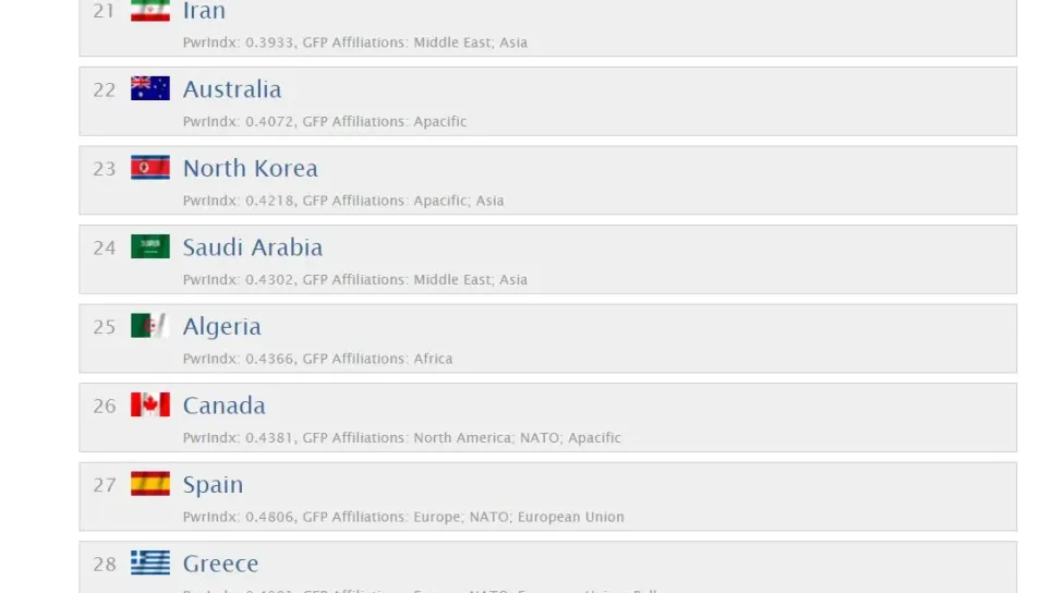 صنف موقع "Global Fire Power"، الجزائر المركز 25 عالميا والثالثة عربيا، قائمة تصنيف القوة العسكرية لدول العالم لعام 2017، مصر 10 عالميا، والسعودية.