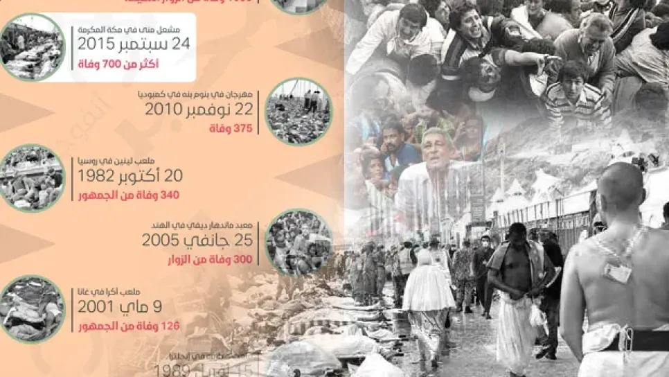 شهدت عدة مناطق من العالم حوادث مأساوية جراء تدافع أمواج بشرية ولأسباب مختلفة آخرها تدافع الحجاج بمكة المكرمة، والتي ذهب ضحيتها أكثر من 700 شخص.فيما يلي أنفوغرافيك لبعض التدافعات المأساوية :