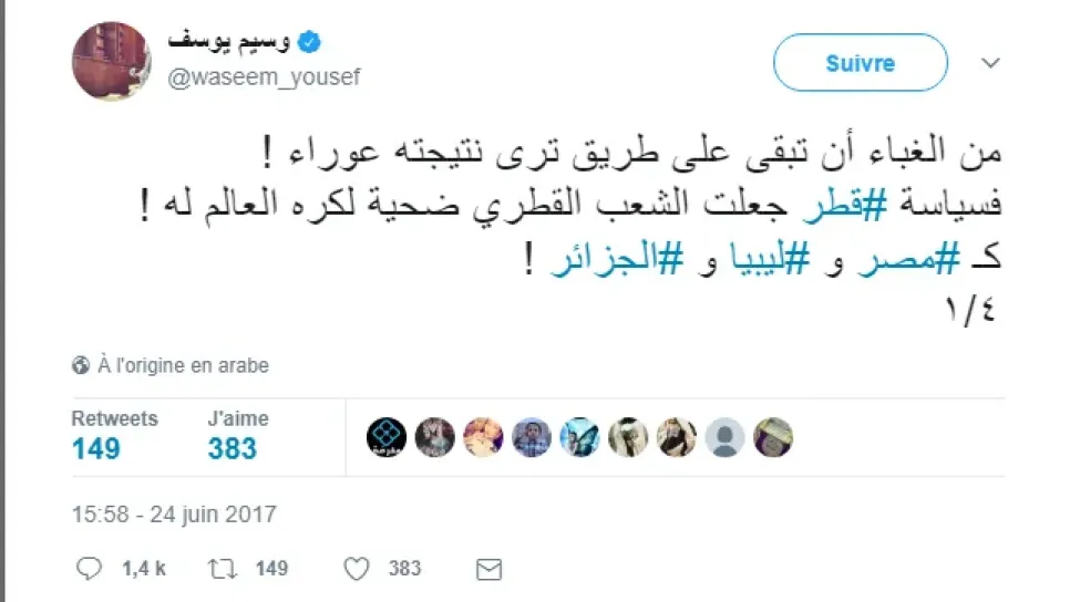 عرفت ليلة عيد الفطر، شن الآلاف من الجزائريين حملة ضد "الداعية" الاماراتي من أصول أردنية، وسيم يوسف، بعد أن نصب نفسه ناطقا باسهم عبر تغريدة، قال فيها أن الجزائريين يكرهون قطر. في ليلة عيد الفطر وفي الوقت الذي شرع فيه آلاف المسلمين عبر العالم يتبادلون تهاني العيد، فضل الداعية وسيم يوسف مواصلة تركيز تغريداته حول الأزمة القطرية، ما جعل حسابه في تويتر يتحول أكثر الى حساب محلل سياسي منه حساب لداعية اسلامي. وجاء في التغريدة التي شعلت فتيل الحملة الجزائرية " من الغباء أن تبقى على طريق ترى نتيجته عوراء ! فسياسة قطر جعلت الشعب القطري ضحية لكره العالم له ! كمصر و ليبيا و الجزائر !". ليأتي الرد في مرحلة...