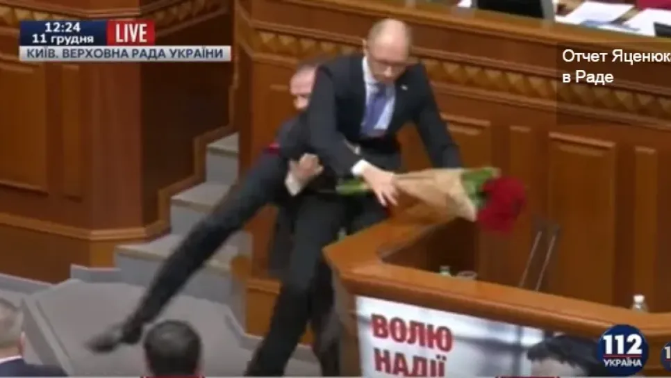 بعد أن بدأ رئيس الوزراء الأوكراني أرسيني ياتسينيوك قراءة العبارات الأولى من تقريره، وتطرق إلى أعضاء الحكومة المتورطين في التقصير الحاصل وهم من "تكتل بترو بوروشينكو" رئيس الجمهورية الحالي، اشتبك فريقان من البرلمانيين أحدهما من كتلة "الجبهة الشعبية" التي ينتمي إليها ياتسينيوك، والثاني يمثل تكتل رئيس الجمهورية. ياتسينيوك وهو على المنبر لم يلق آذانا صاغية له رغم النداءات والترجي، بل أثار حفيظة البرلمانيين أكثر من ذي قبل، مما اضطر رئيس البرلمان فلاديمير غرويسمان لحمايته من الغاضبين وحمله والابتعاد به عن المنبر تفاديا لغضبهم، هذا وكان من المقرر أن يلقي ياتسينيوك تقريره على البرلمانيين الذين أ...