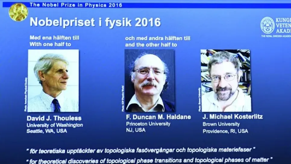 منحت جائزة نوبل الفيزياء للعام 2016 إلى البريطانيين الثلاثة ديفيد ثاوليس وف. دانكن هولداين وج. مايكل كوستيرليتس لأبحاثهم حول المادة. وقالت مؤسسة نوبل الثلاثاء إن أبحاث العلماء الثلاثة "أتاحت إحراز تقدم في الفهم النظري للأسرار الغامضة للمادة، وفتحت آفاقا جديدة في تطوير مواد مبتكرة". وكانت جائزة نوبل العام الماضي قد ذهبت للعالمين الياباني تاكاكي كاجيتا، والكندي آرثر ب. ماكدونالد "لاكتشافهما تذبذبات النيوترينو" ما يسمح بفهم الآلية الداخلية للمادة ومعرفة أفضل للكون. يذكر أن الحائزين على جائزة نوبل يحصلون على مكافأة مالية قدرها ثمانية ملايين كورونة سويدية، أي ما يقارب 855 ألف يورو.