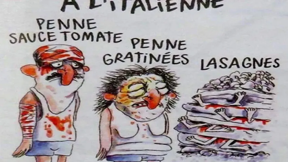 نشرت مجلة "شارلي ايبدو" الفرنسية الساخرة في عددها رسما كاريكاتوريا لضحايا الزلزال الذي ضرب وسط إيطاليا مؤخرا ما أثار موجة غضب واستنكار في إيطاليا وخارجها وقال وزير العدل الإيطالي أندريا أورلاندو إن "هذه الرسوم تثير الاشمئزاز، لا أرى فائدة من التعليق أكثر، لأنني أعتقد أننا إذا فعلنا ذلك نكون نحقق ما يسعون إليه، أي إثارة فضيحة، وبالتالي حصول نقاش وجذب انتباه وسائل الإعلام". بدوره، أكد رئيس مجلس الشيوخ بييترو غراسو على أهمية احترام حرية السخرية والتهكم، إلا أنه عبر أيضا عن رأيه واستيائه إزاء هذه الرسومات "يمكنني أيضا أن أقول إن لدي الحرية للقول إن كل هذا مقرف". والرسم يحمل عنوان "زلزال على الط...