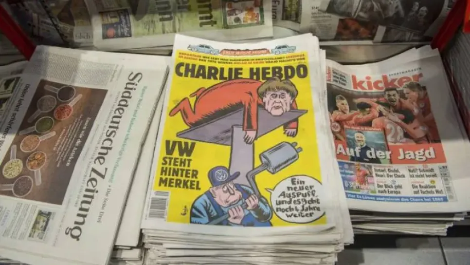 عرضت النسخة الألمانية من مجلة "شارلي إيبدو" الفرنسية الساخرة، للبيع في الأسواق الألمانية، وجاء غلاف العدد الأول ساخرا من قرار المستشارة أنغيلا ميركل الترشح لفترة ولاية رابعة. وتضم النسخة الألمانية، التي يبلغ سعرها 4 يورو، في معظمها محتوى مترجما من النسخة الفرنسية، إلا أنها تشمل مواد جرى إعدادها حصريا للنسخة الألمانية من هيئة التحرير في مكتب باريس. ويظهر على غلاف العدد الأول الذي طرح للبيع، الخميس، رسم كاريكاتيري للمستشارة الألمانية مستلقية فوق طاولة في ورشة إصلاح سيارات، وعنوان يقول " فولكس فاغن تقف وراء ميركل"، وتحت الصورة رسم لميكانيكي يقول " أنبوب عادم جديد، وستستمر في السير لأربع س...