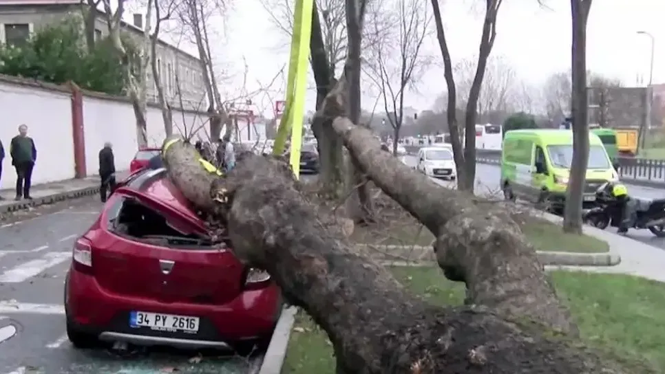 تداول رواد وسائل التواصل الاجتماعي فيديو يرصد لحظة وقوع شجرة عملاقة على ثلاثة مارة، كما أنها دمرت سيارة على أقل تقدير، بسبب الرياح القوية في منطقة سيسلي التركية في اسطنبول. ووفقا لوسائل إعلام، فإن المارة أصيبوا ببعض الخدوش والكدمات، بينما تضررت سيارتان بشكل كبير. وأضافت وسائل الإعلام أنه تم إزالة الشجرة فيما بعد من الطريق. ويشار إلى أن السلطات أعلنت، في وقت سابق، عن اقتراب عواصف ورياح شديدة ستضرب المنطقة.