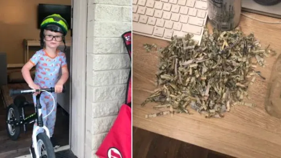 طفل يضع مدخرات والديه في ماكينة "فرم" الورق