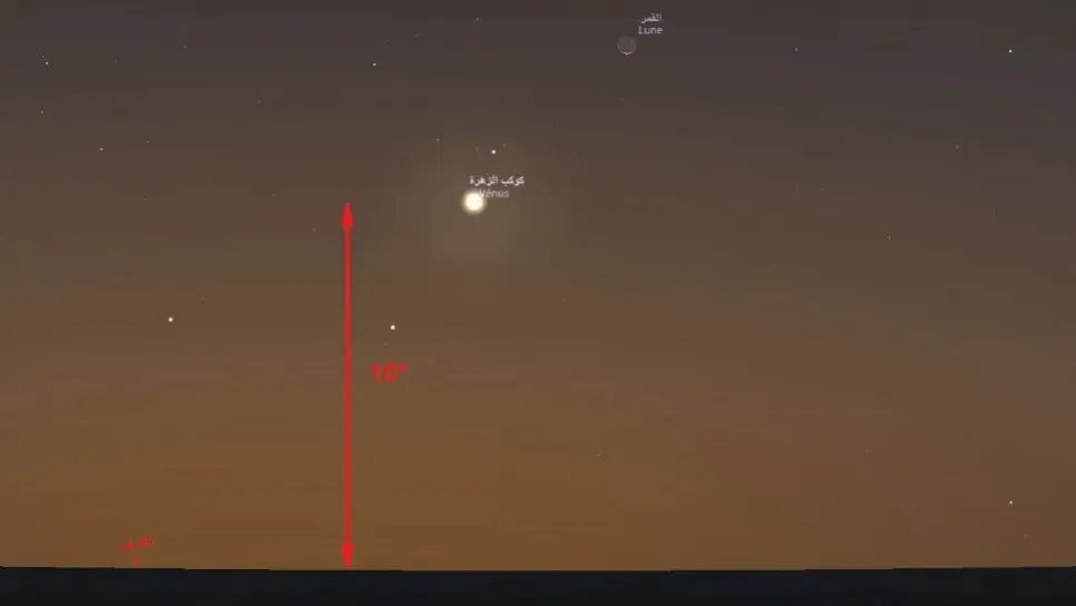أكد مركز البحث في علم الفلك والفيزياء الفلكية أن يوم الأحد 19 أكتوبر 2025 قبل شروق الشمس، على الساعة 6 صباحًا بالتوقيت المحلي، سيتمكن فيه عشاق السماء في اتجاه الشرق من مشاهدة هلال القمر وكوكب الزهرة على ارتفاع 15 درجة من الأفق.