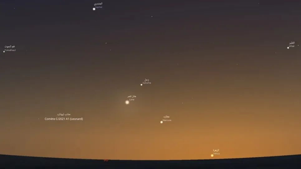 أفاد مركز البحث في علم الفلك والفيزياء الفلكية والجيوفيزياء أن سماء الجزائر ستشهد ليلة اليوم الثلاثاء تقاربا ظاهريا رائعا وفريدا لأربعة كواكب ساطعة المشتري وزحل وعطارد والزهرة مع هلال القمر. وأضاف المركز في منشور عبر صفحته في موقع التواصل الاجتماعي فايسبوك، أنه يمكن كذلك مشاهدة على يمين ويسار الكواكب نجمين ساطعين، يتعلق الأمر بفم الحوت لكوكبة الحوت الجنوبي والطير لكوكبة النسر، بينما يكون مذنب ليونارد حاضرا أيضا في هذا التقارب حيث سنشهده أسفلها، لكنه لن يكون مرئيا بالعين المجردة مما يتطلب منظارا أو تلسكوبا صغيرين. وأوضح نفس المصدر أنه بإمكان عشاق الفلك وهواة رصد السماء اغتنام فرصة الرصد والاس...