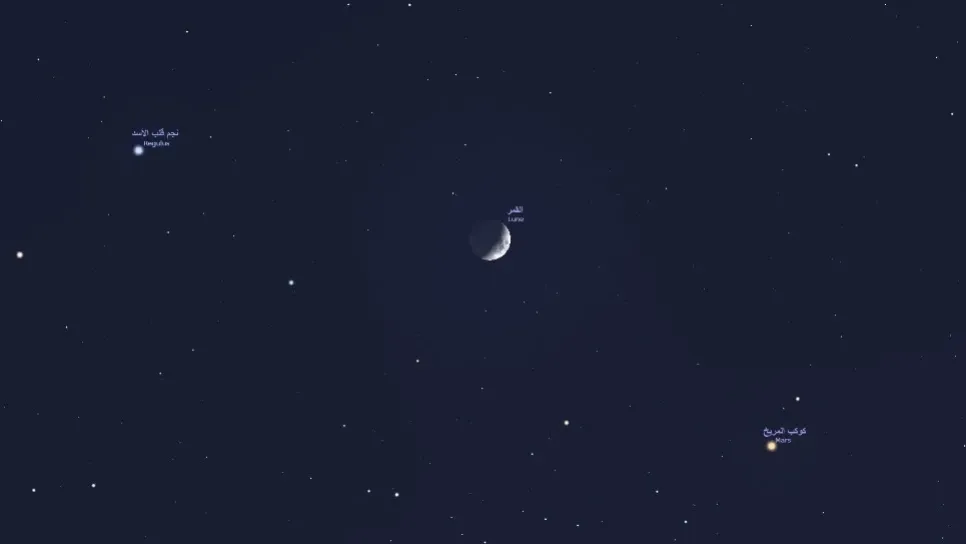 ووفق بيان ذات المركز، اليوم الجمعة، فإن "عشاق السماء سيتمكنون من المشاهدة بالعين المجردة في اتجاه الغرب تقارب وثيق للقمر وكوكب المريخ والنجم قلب الأسد لكوكبة الأسد على ارتفاع 50 درجة من الأفق".