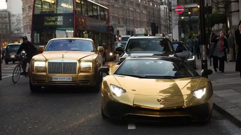 ماذا كنت سكان " إنجلترا" وتفاجأت بأسطول السيارات ذات الماركات الثمينة، لتكتشف أنها مصنوعة الذهب الخالص، تسير صف واحد، يكن المشهد عالم الخيال.