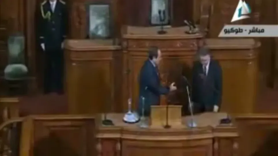 تعرض الرئيس المصري عبد الفتاح السيسي، لموقف محرج على الهواء، في أثناء صعوده على منصة البرلمان الياباني المعروف بـ"الدايت"، لإلقاء كلمته أمام أعضاء البرلمان الياباني اليوم الاثنين. وحسب ما جاء في موقع "عربي 21" فقد اصطحب رئيس البرلمان الياباني، السيسي لإلقاء كلمته، ومد الأخير يده لمصافحته، لكنه فوجئ به يدير ظهره له، دون أن يشاهد يده الممدودة، التي سرعان ما طواها السيسي، وحاول السيسي تجاوز الموقف باصطناع ابتسامة عريضة على وجهه، وساعده الحضور بالتصفيق له، ما زاد في ابتسامته. كما أن الرئيس المصري تلعثم في نطق آية قرآنية لدى استشهاده بها، ولم ينطقها بشكل سليم حين ألقى ألقى كلمة قال فيها إ...