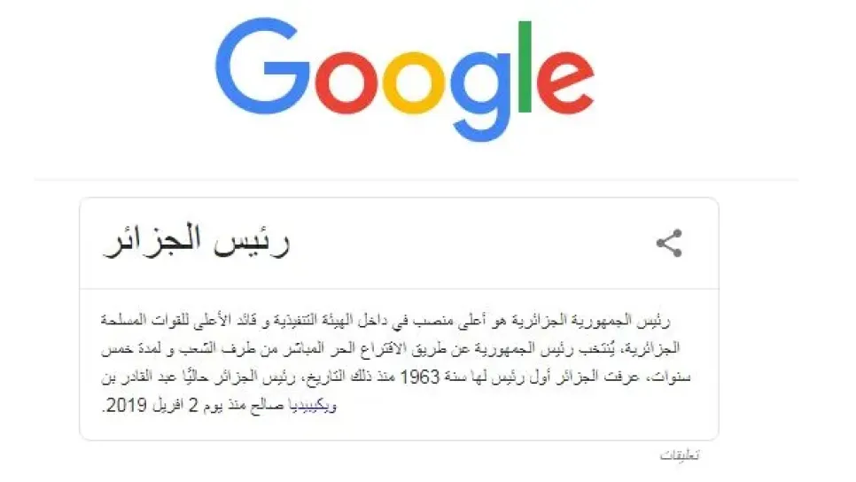 يبدو أن الموسوعة الالكترونية "ويكيبديا" قد نصّبت رئيس مجلس الأمة عبد القادر بن صالح رئيسا للجزائر. و يظهر الموقع في نتائج البحث عند كتابة " رئيس الجزائر" معلومات تعريفية عن منصب رئيس الجمهورية الجزائرية بالإضافة إلى إسم الرئيس الحالي، حيث ورد أن بن صالح يتولى قيادة البلاد حاليا بعد استقالة الرئيس بوتفليقة منذ يوم الثلاثاء 02 أفريل.
