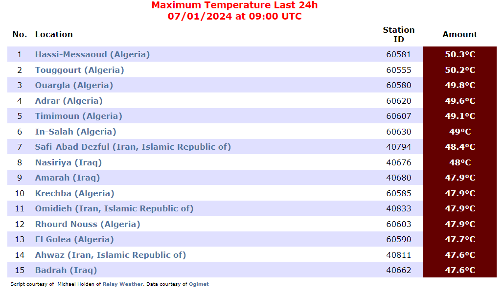 أفادت مراكز الرصد الجوي العالمية، اليوم الإثنين، أن ثمانية مناطق جزائرية صنفت ضمن أكثر المناطق حرا في العالم. ومن بين 10 دول التي سجلت درجات حرارة قياسية وصلت 50.3 درجة تحت الظل، هي حاسي مسعود، التي تحتل المرتبة الأولى عالميا، بـ 50.3 درجة، - ووفق ذات المصادر- لتليها تقرت بـ 50.2 درجة، تم ورقلة بـ 49.8 درجة، وأدرار بـ 49.6 درجة. ومنطقة تيميمون بـ 49.1 درجة، وعين صالح بـ 49 درجة وغرداية بـ 47.9 والمنيعة بـ 47.7 درجة.