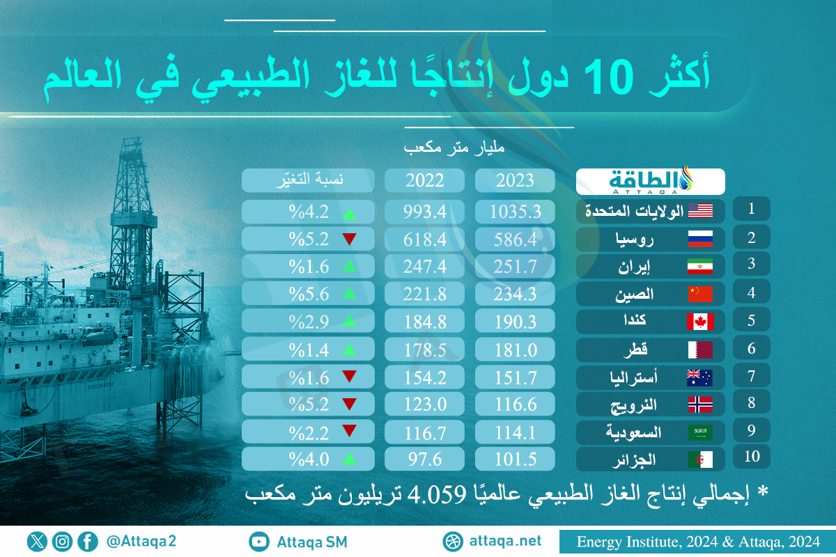 لم تشهد قائمة أكبر 10 دول منتجة للغاز الطبيعي في 2023 أيّ تغيير، حتى مع تراجع إنتاج 4 بلدان، بينما احتفظت 3 دول عربية بترتيبها ضمن الكبار، بارتفاع إنتاج الغاز الطبيعي عالميًا بنسبة 0.3 بالمائة إلى 4.059 تريليون متر مكعب، وفق ما رصدت منصة وحدة أبحاث الطاقة (مقرّها واشنطن). وحسب تقرير المراجعة الإحصائية السنوية للطاقة العالمية الصادر عن معهد الطاقة البريطاني (Energy Institute) فإن الولايات المتحدة الأمريكية حافظت على صدارة قائمة أكبر 10 دول منتجة للغاز الطبيعي في 2023، بحجم إنتاج قياسي تجاوز تريليون متر مكعب، ما يزيد بنسبة 4.2 بالمائة على مستواه البالغ 993.4 مليار متر مكعب في عام 2022. كما احت...