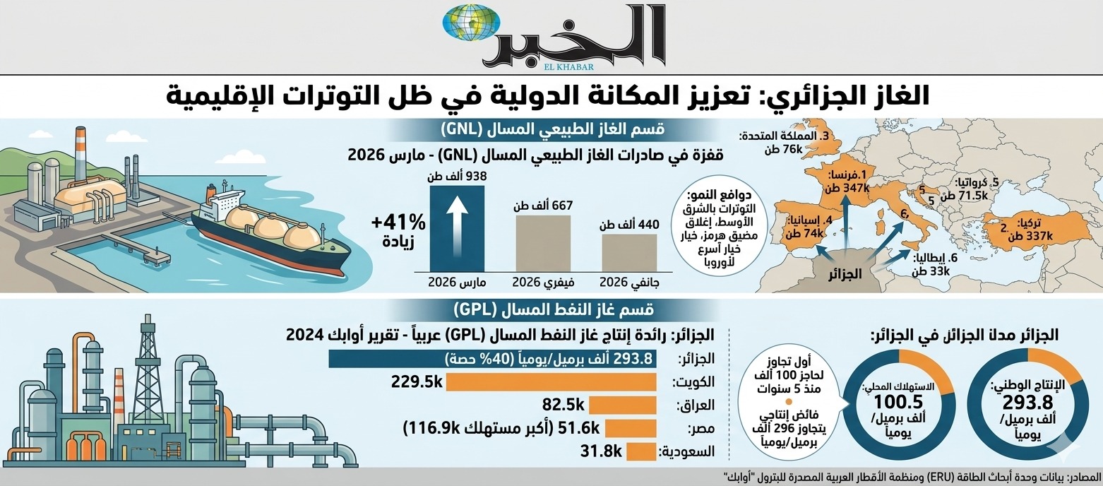 أكدت بيانات وحدة أبحاث الطاقة (ERU) بواشنطن أن صادرات الجزائر من الغاز الطبيعي المسال (GNL)  قفزت بنسبة 41 بالمائة، خلال شهر مارس 2026، لتصل إلى 938 ألف طن، مقابل 667 ألف طن في فيفري و440 ألف طن في جانفي، مدفوعة بالاضطرابات الجيوسياسية في الشرق الأوسط وإغلاق مضيق هرمز، ما جعل الإمدادات الجزائرية الخيار الأسرع والأقل خطورة للأسواق الأوروبية التي تتجه نحو تنويع مصادرها، فيما تصدّرت فرنسا قائمة الوجهات المستوردة بـ347 ألف طن، متبوعة بتركيا (337 ألف طن)، ثم المملكة المتحدة (76 ألف طن)، وإسبانيا (74 ألف طن)، وكرواتيا (71,5 ألف طن)، وإيطاليا (33 ألف طن).