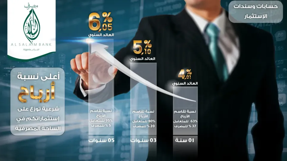 وزع مصرف السلام الجزائر على متعامليه أصحاب الإيداعات الإستثمارية للثلاثي الرابع على التوالي من سنة 2019 أعلى نسبة أرباح سنوية يتم توزيعها في السوق حيث بلغت 6.44% سنويا من مبلغ الإيداع بمبلغ إجمالي بلغ 1.2 مليار دينار(120 مليار سنتيم). بيان البنك وزع مصرف السلام الجزائر على متعامليه أصحاب الإيداعات الإستثمارية للثلاثي الرابع على التوالي من سنة 2019 أعلى نسبة أرباح سنوية يتم توزيعها في السوق حيث بلغت 6.44% سنويا من مبلغ الإيداع بمبلغ إجمالي بلغ 1.2 مليار دينار(120 مليار سنتيم). واستفاد متعاملو المصرف أصحاب حسابات الاستثمار وسندات الاستثمار خلال الثلاثي الرابع من سنة 2019 من عائد على است...