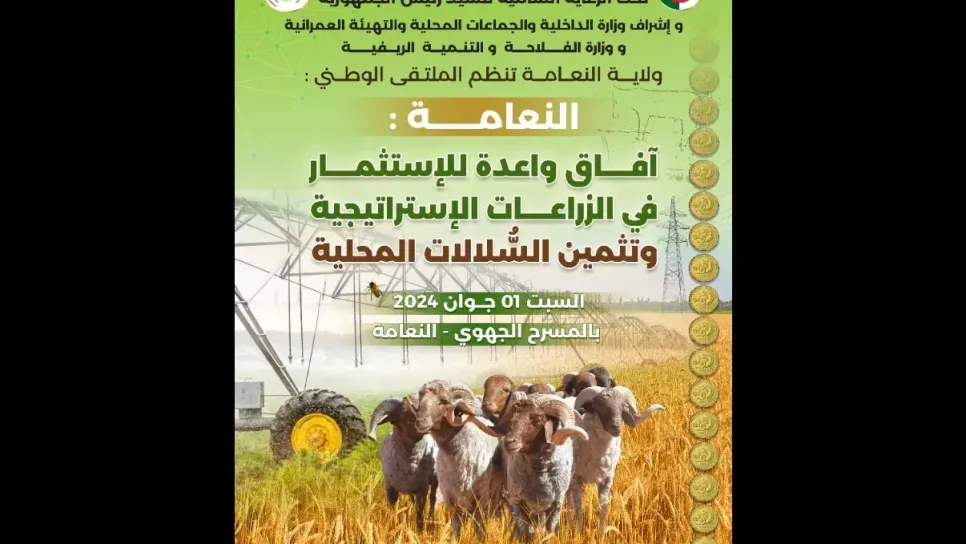 تنطلق اليوم السبت، بولاية النعامة، فعاليات الملتقى الوطني بعنوان النعامة: آفاق واعدة للاستثمار الزراعات الاستراتيجية وتثمين السُّلالات المحلية، والمُنظم تحت الرعاية السامية لرئيس.
