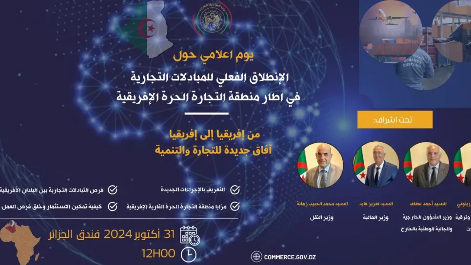 يشرف، يوم غد الخميس، وزير التجارة وترقية الصادرات، الطيب زيتوني برفقة وزراء الشؤون الخارجية والجالية الوطنية بالخارج، والمالية و النقل، حسب بيان للوزارة، على افتتاح اليوم الإعلامي حول الانطلاق الفعلي للمبادلات التجارية في إطار منطقة التجارة الحرة الإفريقية. وهذا ابتداءً من الساعة الحادية عشرة والنصف صباحًا، بفندق الجزائر، بالعاصمة.