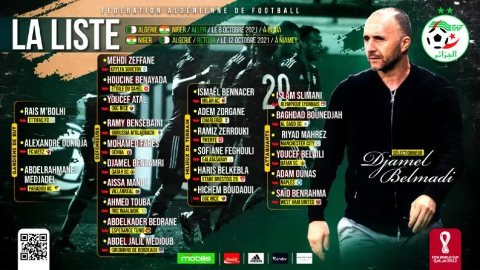 Le sélectionneur national, Djamel Belmadi, a fait appel à 25 joueurs, en vue des 2ème et 3ème journées des éliminatoires de la Coupe du monde 2022, qui opposera le vendredi 8 octobre la sélection nationale de football au Niger, à Blida à 20h, et le mardi 12 octobre à 17h à la même équipe au stade du général Seyni Kountché, a rapporté aujourd’hui la Fédération algérienne (FAF) sur son site officiel. Gardiens de but :Raïs M’BOLHI (Ettifaq FC...