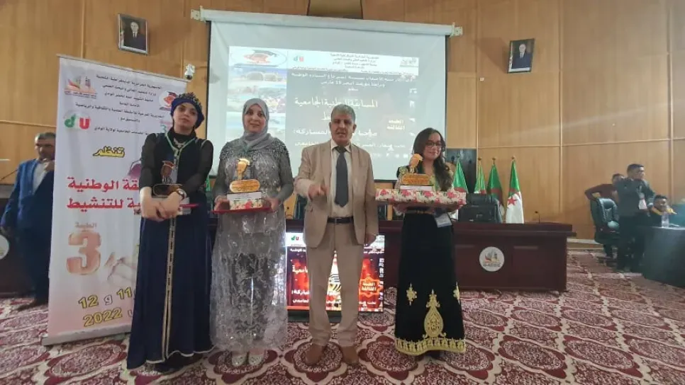 L’étudiante Zoughliche Malia, de l’université Boubnider Constantine 2 a décroché la première place du classement au concours universitaire national de l’animation, organisé au bout de trois jours, au niveau de l’université du Martyr Hama Lakhdar à El Oued.La deuxième place est revenue à l’étudiante Anfal Harous, de l’université Mohamed Lamine Debaghine, Sétif 2, suivie par l’étudiante Chorfi Rokaya, de l’université Mohamed Benyahya El Ouencher...