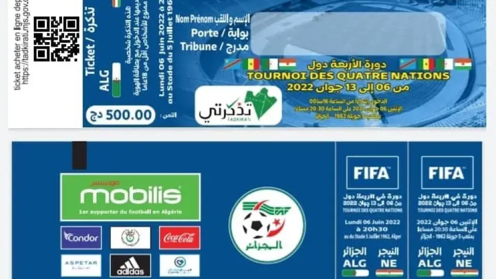 Le ministère de la jeunesse et des sports a annoncé, ce lundi, sur sa page facebook, que les billets pour le match Algérie-Niger prévue ce soir à 20h30 au stade du 5 juillet seront vendus sur la plate-forme en ligne tadkirati.mjs.gov.dz. Ce match s’inscrit, pour rappel, dans le cadre du tournoi des quatre nations (Algérie, Niger, République Démocratique du Congo et Sénégal) dans le cadre des préparatifs de l’équipe nationale pour le prochaine CHAN, qui aura lieu en Alg&ea...