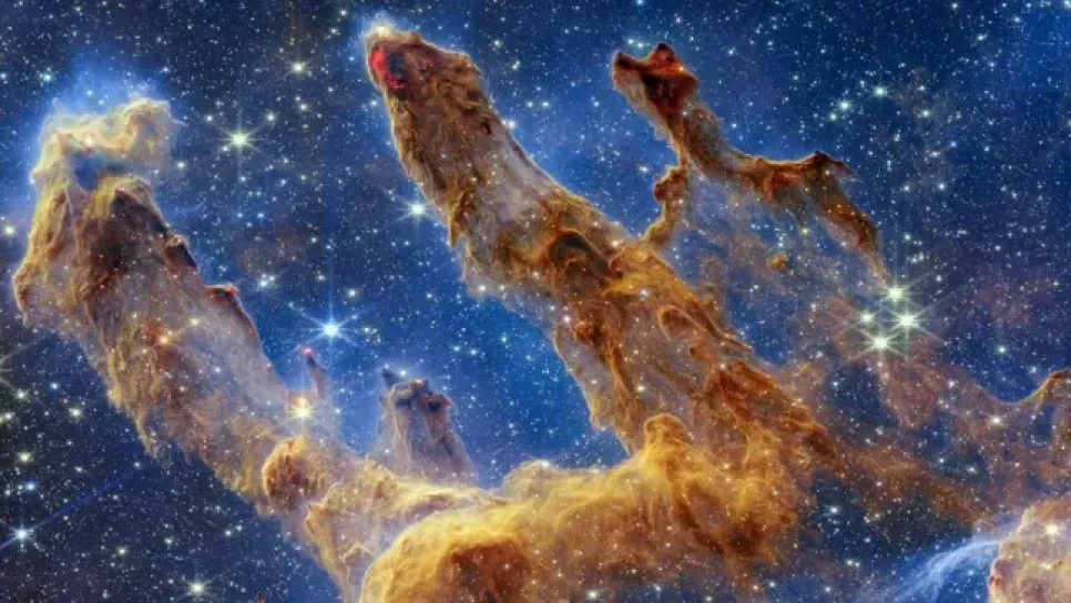 Le télescope James Webb a révélé ce mercredi son premier cliché des emblématiques « Piliers de la création », d’immenses structures de gaz et de poussière regorgeant d’étoiles en formation.Le scintillement de milliers d’étoiles illumine toute l’image, sur laquelle ces gigantesques colonnes brunes et orangées se dressent dans l’immensité du cosmos.Des zones d’un rouge intense, à l’extrémité de plusieurs des piliers, évoquent de la...