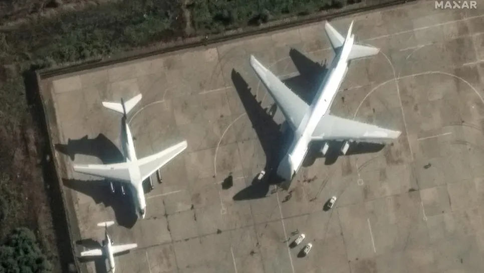 Des images satellites de vendredi ont montré le transfert de matériel militaire russe à la base de Hmeimim, avec deux avions cargos Antonov An-124 visibles.