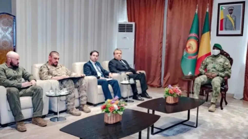 Goïta est apparu portant un masque médical, accompagné d'une délégation russe composée de six personnes, dont quatre en tenue militaire.