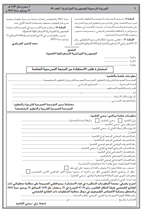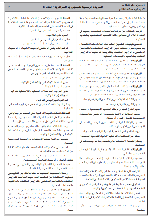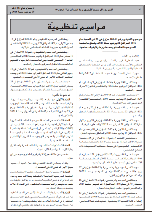 Le décret exécutif n° 25-168, publié au Journal officiel en date du 22 juin 2025, définit les conditions et modalités de bénéfice de la prime scolaire spéciale.