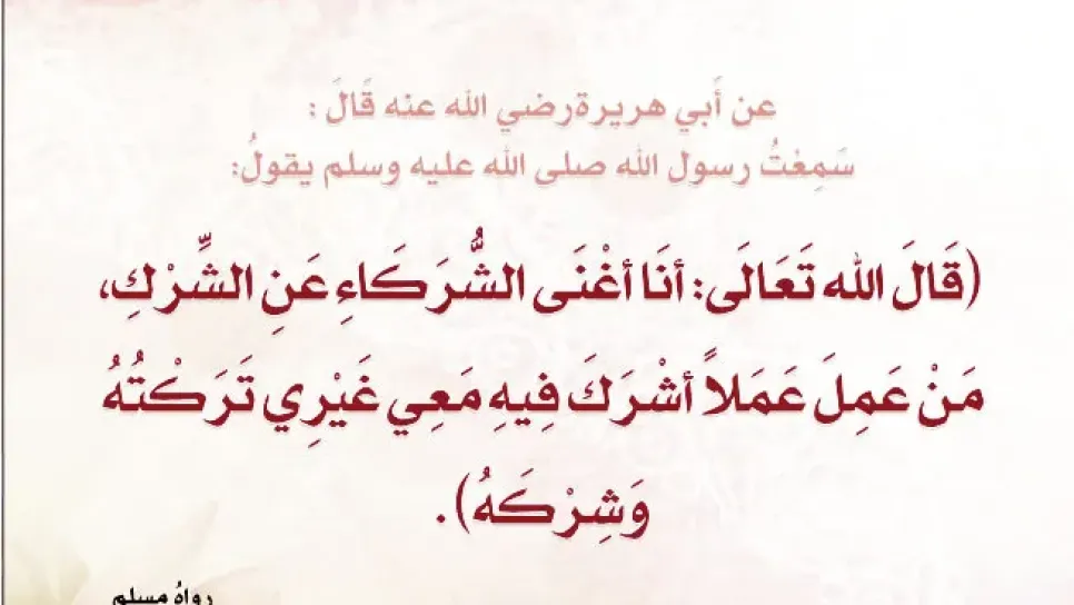 عن أبي هريرة رضي اللّه عنه قال: قال رسول اللّه صلّى اللّه عليه وسلّم: قال اللّه تبارك وتعالى: “أنا أغْنَى الشُّركاء عن الشِّرك، مَن عمل عملاً أشرك فيه معي غيري تركته وشركه” رواه مسلم، وفي رواية ابن ماجه: “فأنا منه بريء وهو للّذي أشرك”. معنى الحديث: أنا غنيّ عن أن يشاركني غيري، فمَن عمل عملاً لي ولغيري لم أقبله منه، بل أتركه لذلك الغير.جاءت نصوص الكتاب والسنّة بالتّرهيب من أن يقصد الإنسان بعبادته غير اللّه، وعدَّت ذلك من عظائم الذّنوب بل من الشّرك باللّه، لأنّه ينافي الإخلاص الّذي يقتضي أن يقصد المسلم بعمله اللّه وحده لا شريك له، قال سبحانه: {وَمَا أ...