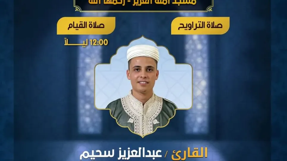 سيقوم القارئ الجزائري عبد العزيز سحيم بإمامة المصلين هذه الليلة في صلاتي التراويح والتهجد بمسجد آمنة بنت أحمد الغرير بإمارة عجمان بالإمارات العربية المتحدة.