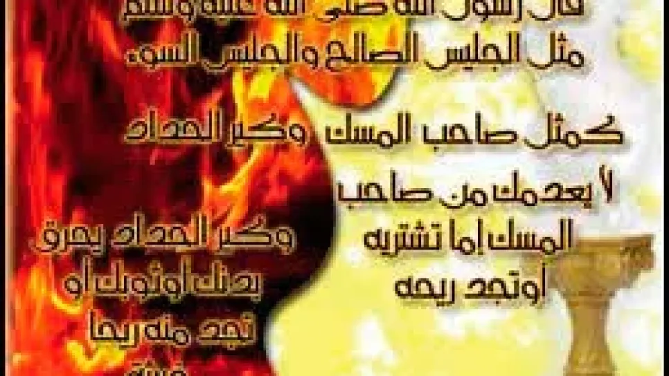 عن أبي موسى الأشعري رضي اللّه عنه أنّ النّبيّ صلّى اللّه عليه وسلّم قال: ”إنما مثل الجليس الصالح والجليس السوء كحامل المسك ونافخ.