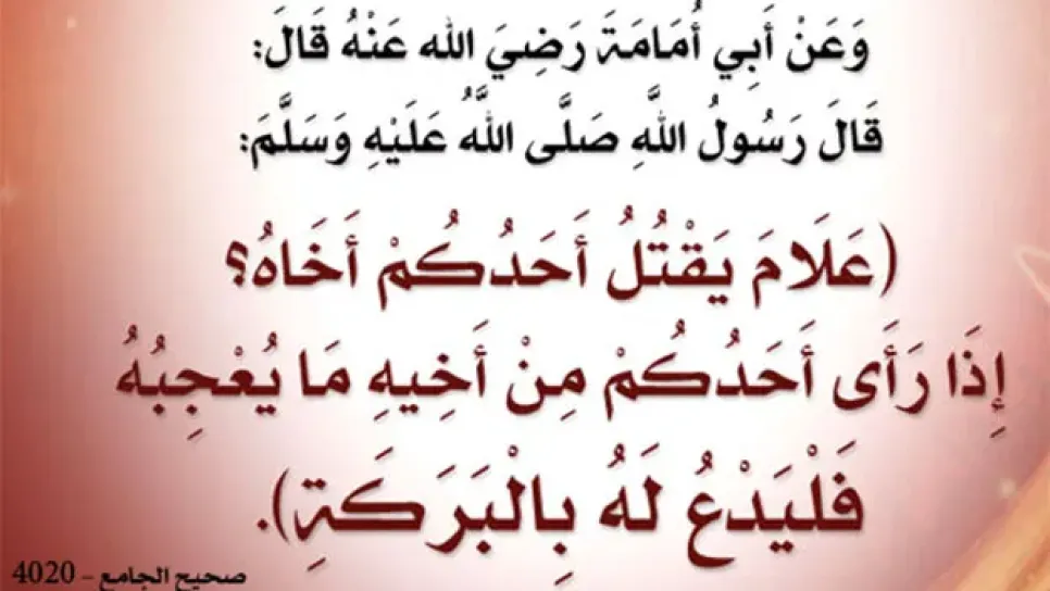 عن أبي أمامة بن سهل بن حنيف رضي الله عنه قال: “مَرّ عامر بن ربيعة بسهل بن حنيف رضي الله عنهما وهو يغتسل، فقال: لم أرَ كاليوم ولا جِلدَ مُخبّأة، فما لبث أن لُبِطَ به (صُرِع بسببه وسقط على الأرض)، فأتي به النّبيّ صلّى الله عليه وسلّم، فقيل له: أدرك سهلاً صريعًا، قال: “مَن تتّهمون به؟”، قالوا: عامر بن ربيعة، فقال: “علام يقتل أحدكم أخاه؟ إذا رأى أحدكم من أخيه ما يعجبه فليدع له بالبَركة”، ثمّ دعا بماء، فأمر عامرًا أن يتوضّأ، فغسل وجهه ويديه إلى المرفقين، وركبتيه وداخلة إزاره، وأمره أن يصبّ عليه” رواه ابن...