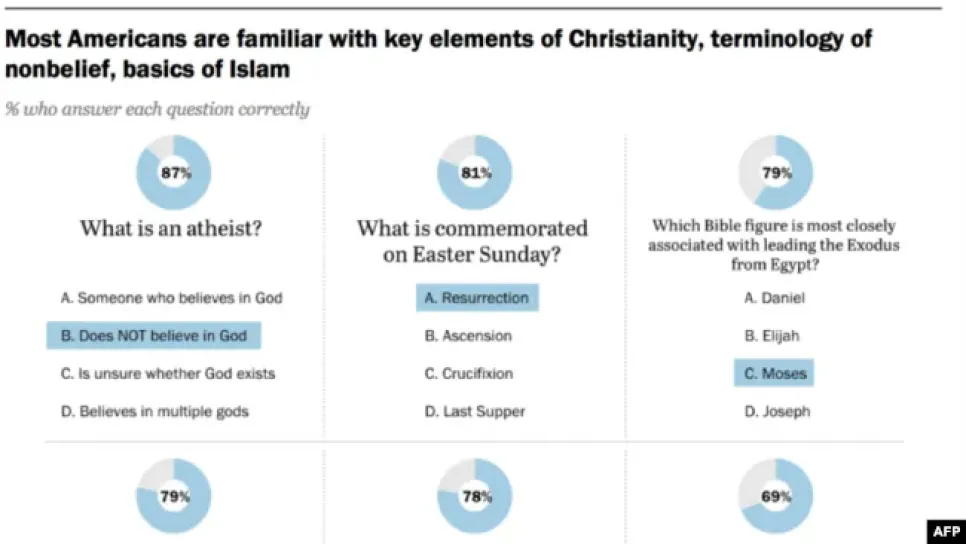 خلصت دراسة أعدّها "مركز بيو للأبحاث"، بعد استجوابه نحو 11 ألفًا من الأمريكيين حول مجموعة من المواضيع المتعلّقة بالأديان، إلى أنّ "معظم الأمريكيين على دراية ببعض أساسيات المسيحية والكتاب المقدّس، وحتّى بعض الحقائق عن الإسلام، لكن عددًا أقلّ بكثير منهم قادر على الإجابة بشكل صحيح على أسئلة واقعية حول اليهودية والبوذية والهندوسية". وأظهرت الدّراسة أنّ الأمريكيين الّذين أجابوا على الأسئلة المتضمنة في الاستجواب استطاعوا الإجابة بشكل صحيح نسبيًا على كلّ ما يتعلّق بالإسلام، وفقًا لقناة "الحرّة" الأمريكية.وبالرّغم من أنّ غالبية المستجوبين لم يستطيعوا تحديد العدد الدّقيق للمسلمين في بلادهم إلّا أنّهم أ...