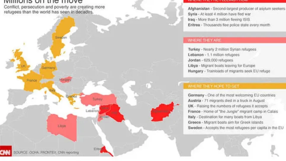 في الوقت الذي يحاول فيه الاتحاد الأوروبي وضع خطط للتعامل مع حجم اللاجئين الكبير من المناطق التي تشهد صراعات حول العالم، نقدم لكم على الخريطة المناطق التي يأتي منها هؤلاء المهاجرون وأين هم في الوقت الحالي والدول الأوروبية التي يقصدونها بحسب تقرير لـOCHA, Frontex. اللون الأحمر يمثل الدول التي تشهد نزاعات وحالة من عدم الاستقرار حيث يصدر منها اللاجئون إلى العالم، مثل أفغانستان وسوريا والعراق وأريتيريا. اللون الزهري يظهر الدول والمناطق التي يتواجد فيها في الوقت الحالي هؤلاء اللاجئون مثل تركيا ولبنان والأردن وليبيا والمجر، وذلك خلال رحلتهم التي يأملون فيها بالوصول إلى دول في أوروبا. اللون البرتقا...