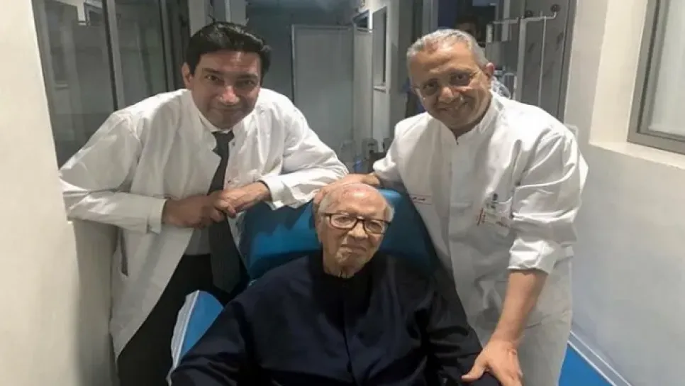 نشرت الرئاسة التونسية أولى الصور للرئيس الباجي قايد السبسي وهو يغادر المستشفى العسكري ،بعد وعكة صحية حادة تعرض لها الخميس الماضي.أظهرت الصور الرئيس السبسي برفقة طبيبه الخاص معز بالخوجة وأمير اللواء طبيب مصطفى الفرجاني المدير العام للصحة العسكرية وبقية الفريق الطبي الذي كان يتابع صحة السبسي.وقبل ذلك أعلن نجل الرئيس والمدير التنفيذي لحزب نداء تونس حافظ قايد السبسي إن الرئيس يوجد بصحة جيدة وأنه خرج من المستشفى.وكان الرئيس قايد السبسي البالغ من العمر 93 عاما قد نقل إلى المستشفى بعد تعرّضه صباح يوم الخميس إلى وعكة صحيّة وصفت بالحادة، استوجبت نقله إلى المستشفى العسكري بتونس العاصمة.