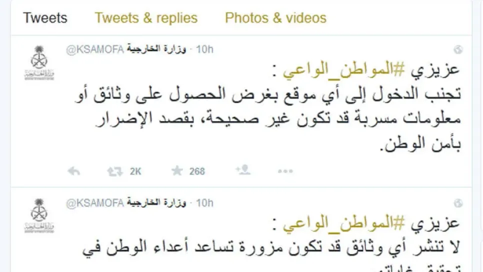 دعت وزارة الخارجية السعودية، الجمعة، عبر صفحتها موقع تويتر الإجتماعي، "مواطنيها تجنب تصفح موقع إلكتروني بغرض الحصول وثائق معلوما.