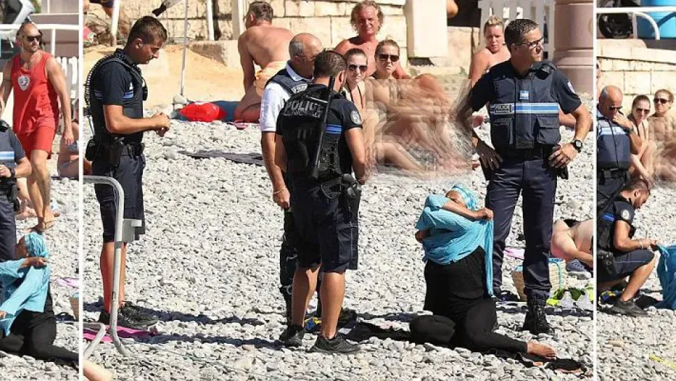 أجربت الشرطة الفرنسية امرأة مسلمة على خلع لباس "البوركينى" أثناء تواجدها بشواطئ مدينة نيس الوقعة على البحر المتوسط. ونشرت وسائل إعلام غربية اليوم الأربعاء، صورًا لعدد من قوات الشرطة الفرنسية، على شواطئ مدينة نيس، تجبر سيدة مسلمة ترتدى "البوركيني" على خلعه. ووقف أكثر من 4 عناصر من الشرطة بجانب المرأة التي كانت تستريح على الشاطئ، وطلبوا منها خلع لباس السباحة المحظور، وهو ما تم فعلا، قبل أن يقوم أحد الضباط بإصدار غرامة مالية بحقها. وقالت المرأة واسمها الأول سيام "كنت جالسة على الشاطئ مع عائلتي، وكنت أرتدي الحجاب الكلاسيكي ولم يكن لدي نية للسباحة"، وأضافت: "الناس من حولي راحوا يصرخون ويصف...
