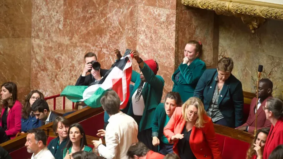 تم، اليوم الثلاثاء، تعليق جلسة الجمعية الوطنية الفرنسية، بعد أن لوحت النائبة، راشيل كيكي، بالعلم الفلسطيني. ورفعت النائبة عن حزب فرنسا الأبية، راشيل كيكي، العلم الفلسطيني مستنسخة ما قام به زميلها سيباستيان ديلوغو الأسبوع الماضي. كما ظهر نواب آخرون يرتدون ملابس بألوان العلم الفلسطيني (الأسود، الأحمر، الأبيض والأخضر) لإظهار دعمهم للشعب الفلسطيني. وكان النائب اليساري الفرنسي عن حزب فرنسا الأبية سيباستيان ديلوغو، قد عوقب بتعليق عضويته لمدة 15 يوما بسبب رفعه العلم الفلسطيني خلال إحدى جلسات البرلمان، حيث قال أنه أقدم على هذه الخطوة اعتراضا على بيع بلاده أسلحة ومعدات عسكرية للجيش الصهيوني الذي ي...