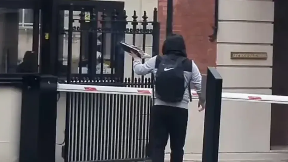 فقد أظهرت لقطات انتشرت، خلال الساعات الماضية على مواقع التواصل، رجلا يحمل حقيبة ظهر وغطاء رأسه مرفوعا، ويرفع كتابا مشتعلا، قيل إنه كان يلوّح به خارج الحاجز المؤدي إلى القنصلية التركية في روتلاند جاردنز، نايتسبريدج في لندن.