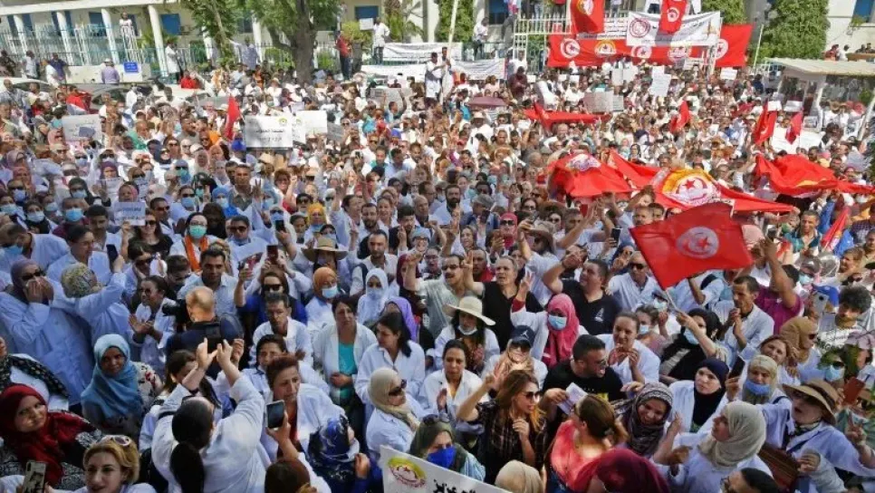 قام الآلاف من أعضاء الطواقم الصحية الحكومية في تونس الخميس بتنفيذ إضراب عام في كامل المستشفيات الحكومية ووقفة احتجاجية بالعاصمة للمطالبة بإصلاحات وبقانون خاص بقطاع الصحة إثر جائحة كوفيد-19.وتجمع المحتجون من الممرضين والتقنيين العاملين بالمستشفيات الحكومية أمام مقرّ وزارة الصحة ورفعوا لافتات كتب عليها "الصحة العمومية ثروة وطنية" و"يا حكومة الفشل واجب إصلاح القطاع" و"الجيش الأبيض لن يتراجع" وسط تعزيزات أمنية، حسب ما أفاد صحافي في وكالة الأنباء الفرنسية في المكان.ويطالب المحتجون بقانون أساسي خاص بهم ينظم وظيفتهم خصوصا بعد أزمة جائحة كوفيد-19 والتي فرضت عليهم العمل بالرغم من الإغلاق التامّ بينما أ...