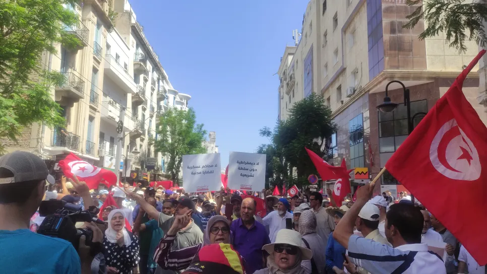 شارك الآلاف من المتظاهرين في مسيرة حاشدة وسط العاصمة التونسية، استجابة لدعوات جبهة الخلاص (ائتلاف سياسي ومدني يضم مجموعة أحزاب وقوة مدنية)، رفضا لما تصفه قوى الجبهة " بالانقلاب على الدستور" وشاركت قيادات من حركة النهضة وحركة أمل التي يقودها نجيب الشابي، وائتلاف مواطنون ضد الانقلاب والجبهة الديمقراطية وائتلاف جبهة الدفاع عن الحريات وشخصيات مستقلة في المظاهرة التي سارت عبر شارع باريس الى غاية شارع الحبيب بورقيبة وتوقفت عند المسرح البلدي. وتعد هذه المظاهرة الأكبر التي تنظمها ائتلاف جبهة الخلاص المعارضة منذ أشهر، ورفعت فيها شعارات تعبر عن رفض الاستفتاء على الدستور المقرر يوم 25 جويلية المقبل، ور...