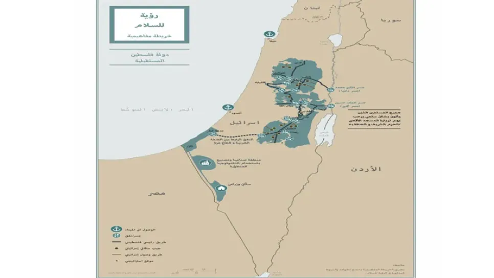 نشر الرئيس الأمريكي دونالد ترامب، عبر حسابه على تويتر، خريطة للدولة الفلسطينية في المستقبل بعد كشفه عن خطته للسلام، قائلا: "هذا ما قد تبدو عليه دولة فلسطين المستقبلية بعاصمة في أجزاء من القدس الشرقية". وأظهرت الخريطة نفقا يربط بين الضفة الغربية وقطاع غزة، إضافة إلى اقتطاع مساحات واسعة من الضفة الغربية مقابل ضم منطقتين معزولتين في صحراء النقب، إحداها صناعية والأخرى سكنية.