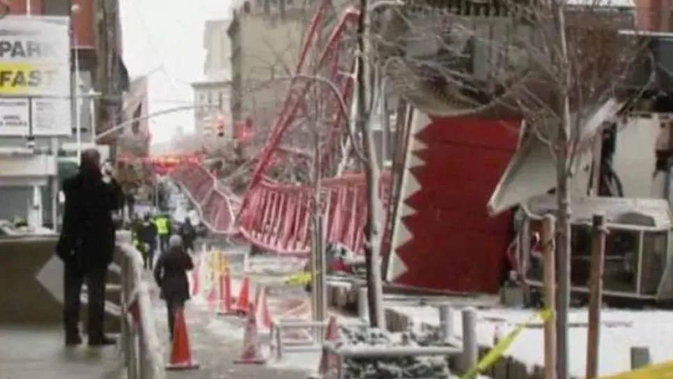 افاد مسؤولون أميركيون بأن رافعة بناء ضخمة انهارت في وسط مانهاتن إثر عاصفة ثلجية قوية مما أدى إلى مقتل شخص على الأقل وسحق صف من السيارات المتوقفة في الشارع خلال وقت الذروة الصباحي. وهرع المئات من رجال الإطفاء وعمال الطوارئ إلى موقع الحادث وقال المتحدث باسم إدارة الإطفاء في نيويورك إن شخصين نقلا إلى مستشفى محلي إثر إصابتهما بجروح خطيرة في الحادث. وأصيب شخص ثالث بجروح طفيفة.