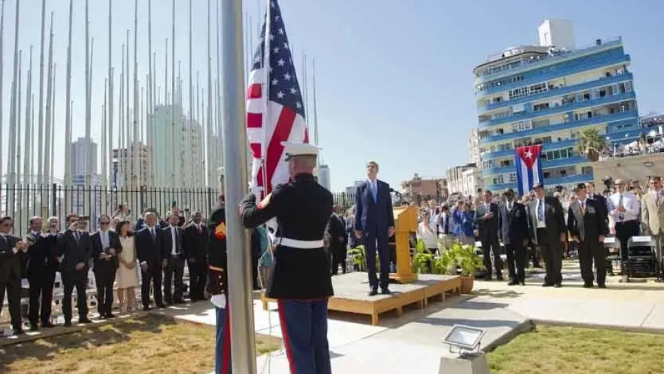 رفع أفراد من مشاة البحرية الأميركية (المارينز) علم الولايات المتحدة فوق السفارة الأميركية في هافانا للمرة الأولى منذ 54 عاما خلال مراسم قادها وزير الخارجية جون كيري بمناسبة استعادة العلاقات الدبلوماسية بين واشنطن وهافانا. وشارك في الاحتفال ثلاثة جنود متقاعدين من المارينز -كانوا قد أنزلوا العلم في عام 1961 - حيث قاموا بتسليم العلم الجديد إلى افراد المراسم الذين رفعوه أمام مبنى السفارة على ساحل البحر في هافانا
