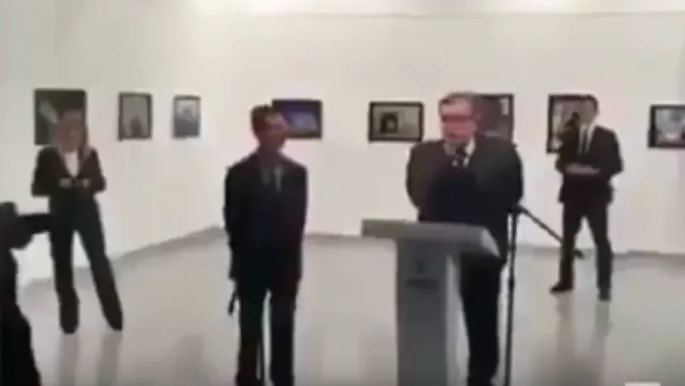 تداول نشطاء مواقع التواصل الاجتماعي "فيس بوك وتويتر"، فيديو جديدا يرصد لحظات ترقب منفذ عملية اغتيال السفير الروسي في تركيا أندريه كارلوف. ويظهر بالفيديو منفذ عملية الاغتيال ميرت الطنيطاش وهو يراقب السفير الروسي من الخلف، متحينًا الفرصة لإخراج مسدسه، حيث تردد الطنيطاش في البداية، لكن أثناء قيام أحد المترجمين بترجمة حديث السفير الروسي باللغة التركية للحضور بمعرض الصور، أدخل منفذ العملية يده بحرص في جيبه مخرجًا المسدس، الذي صوب طلقاته على السفير الروسي، فأرداه قتيلًا في الحال.