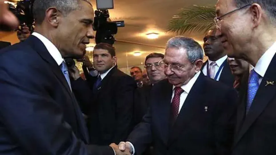 تصافح الرئيس الكوبي، راؤول كاسترو، ونظيره الأمريكي، باراك أوباما، أول أمس الجمعة، وهي المرة الأولى التي يحضر فيها زعيما البلدين تجمعا رسميا منذ انهيار علاقتهما في عام 1961.قالت المتحدثة باسم مجلس الأمن القومي، برناديت ميهان، إن الرجلين اجتمعا وتبادلا التحية قبل المراسم الافتتاحية لقمة الأمريكتين التي تعقد في بنما. وهذه المرة الأولى التي توجه فيها دعوة لكوبا للمشاركة في الاجتماع الإقليمي. وقال الأمين العام للأمم المتحدة، بان كي مون، إن “وجود رئيس كوبا راؤول كاسترو هنا اليوم يجسد رغبة أعرب عنها الكثيرون في المنطقة”. وابتسم كاسترو وضحك وتجاذب أطراف الحديث مع الرئيس البنمي، خوان كارلوس...